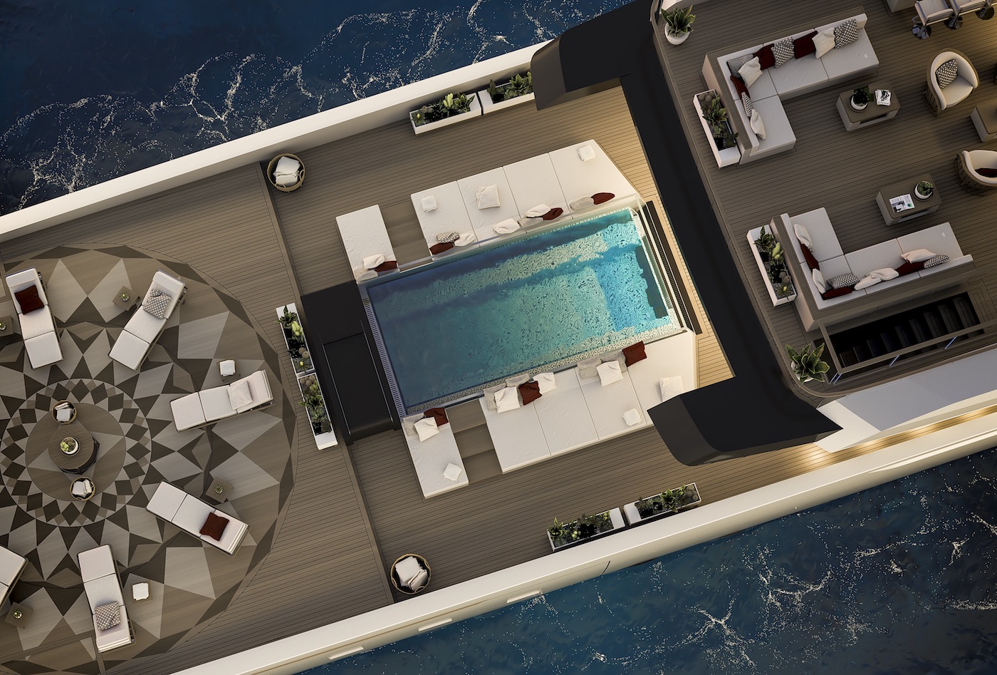 A hatch from the beach club gives access to the flush main deck aft where there is an abundance of furniture for casual lounging and hosting social events, plus a swimming pool surrounded by sun pads that become a focal point for entertaining.