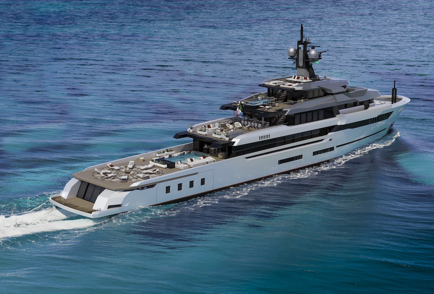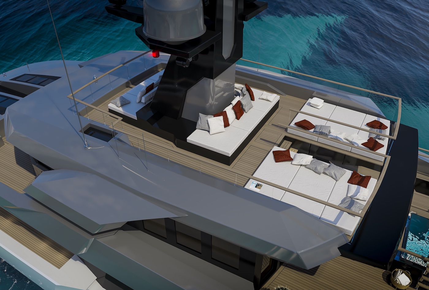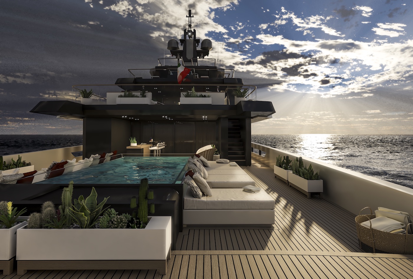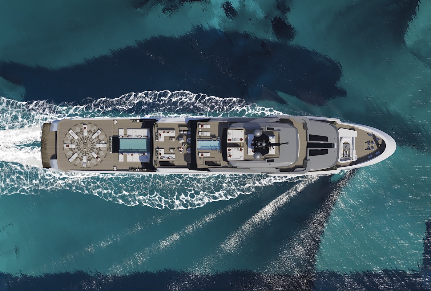 A notable characteristic of the design is the alternating appearance of full and empty decks, which culminates with an array of sunbeds on the sundeck that take in panoramic views to the aft. Just on the deck below, the wheelhouse aft is home to an infinity pool.