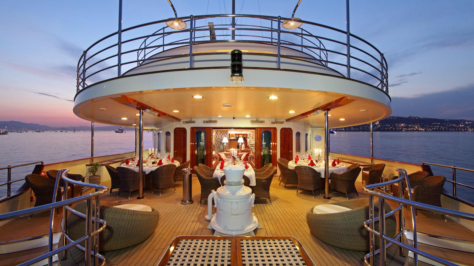 Large groups of friends and family, or corporate guests can be seated on the spacious aft deck for dining