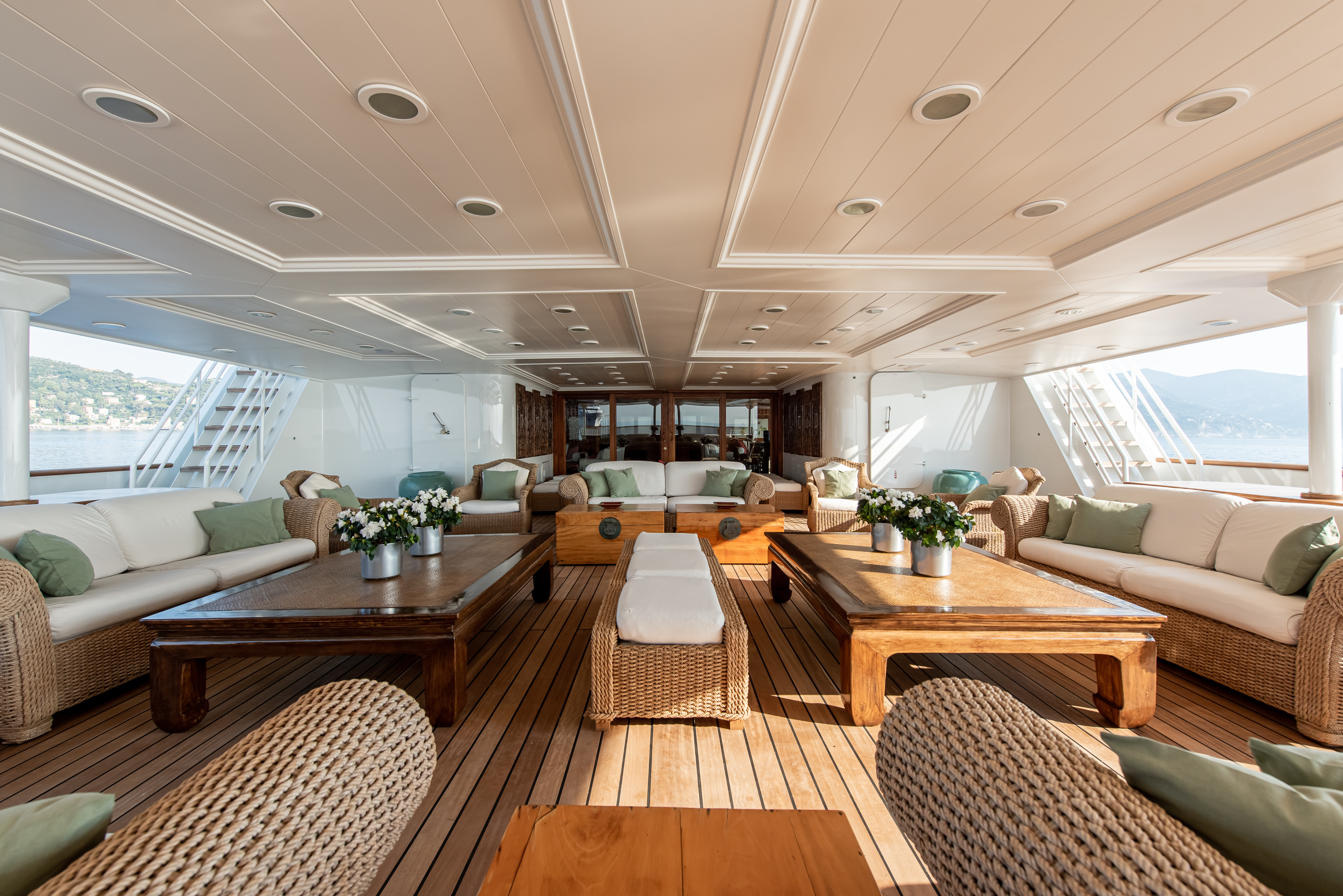 M/Y BLEU DE NIMES has vast outdoor living, laid over 4 decks. The main deck aft is shaded and boasts ample comfortable seating. Up one level and charter guests can relax in the sunshine and enjoy alfresco dining under shade. On the bridge deck aft is a relaxing sitting area, which leads to the sundeck, here there are 2 large Jacuzzis, chaise lounger both fore and aft, plus a fully equipped wet bar with stools.