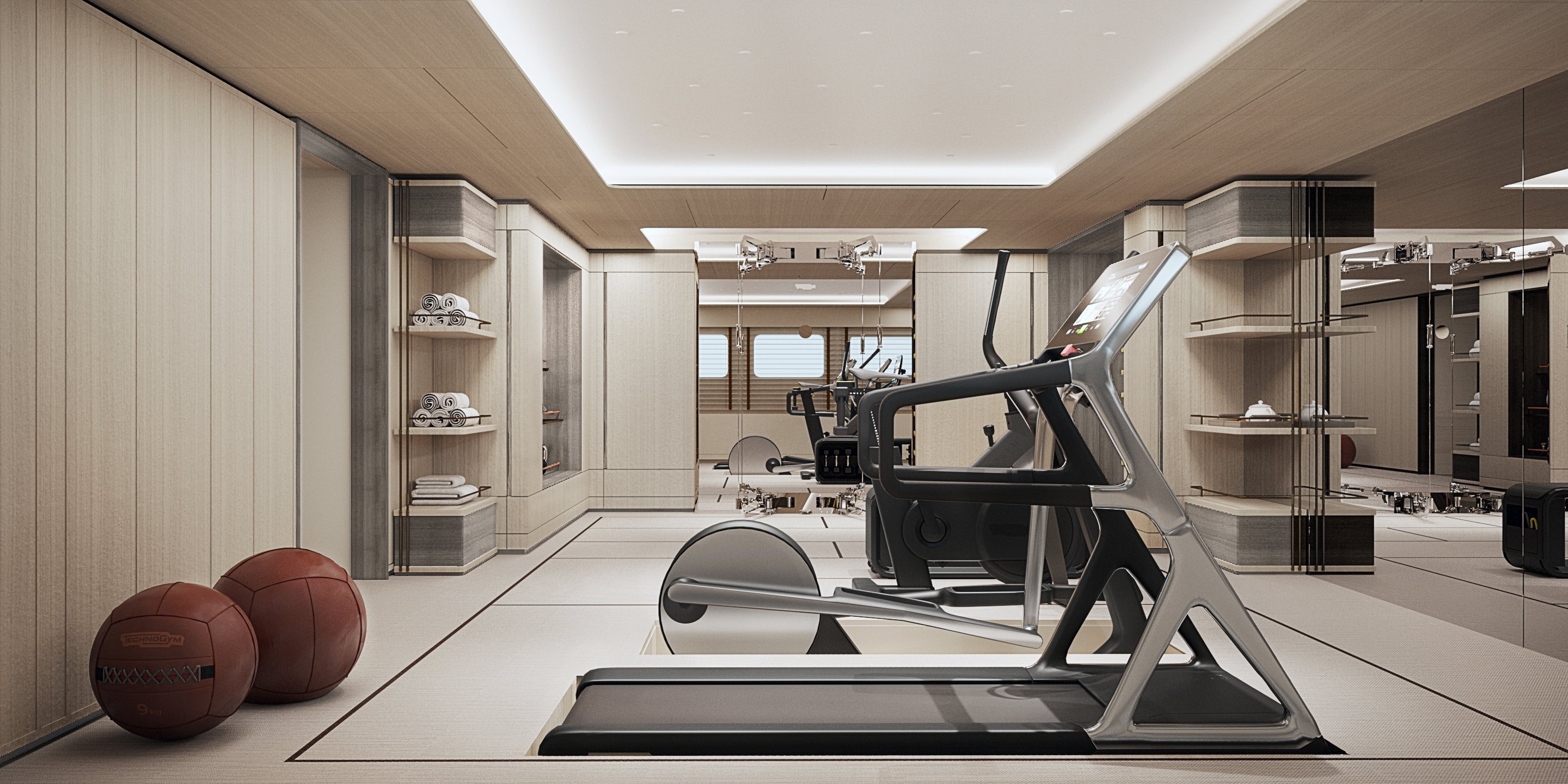 A wellness space in the stern is accessible from the swim platform where, at the touch of a button, the teak stadium steps open to a space that can be converted into a gym, steam room or massage room. Its location adjacent the swim platform also makes it ideal for a dive store.
