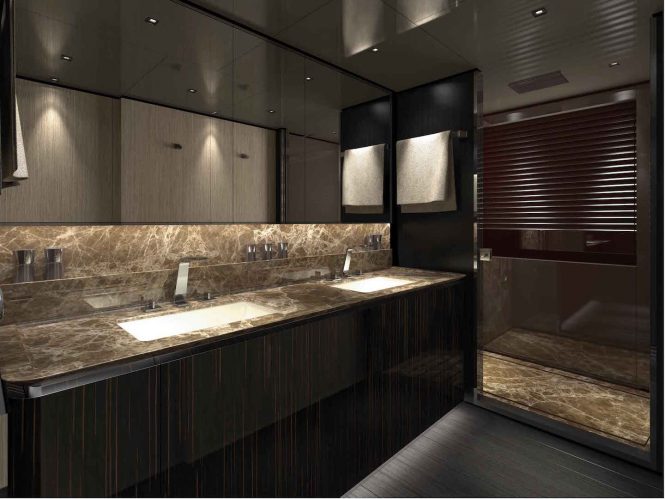 Her accommodation provide for up to 12 guests across six cabins, with the Master suite placed on the Owner’s deck and a VIP stateroom, two double cabins and two twin cabins on the main deck. The combined hair salon and massage room and the Owner’s study can be converted into additional cabins as all rooms have en-suite bathrooms.