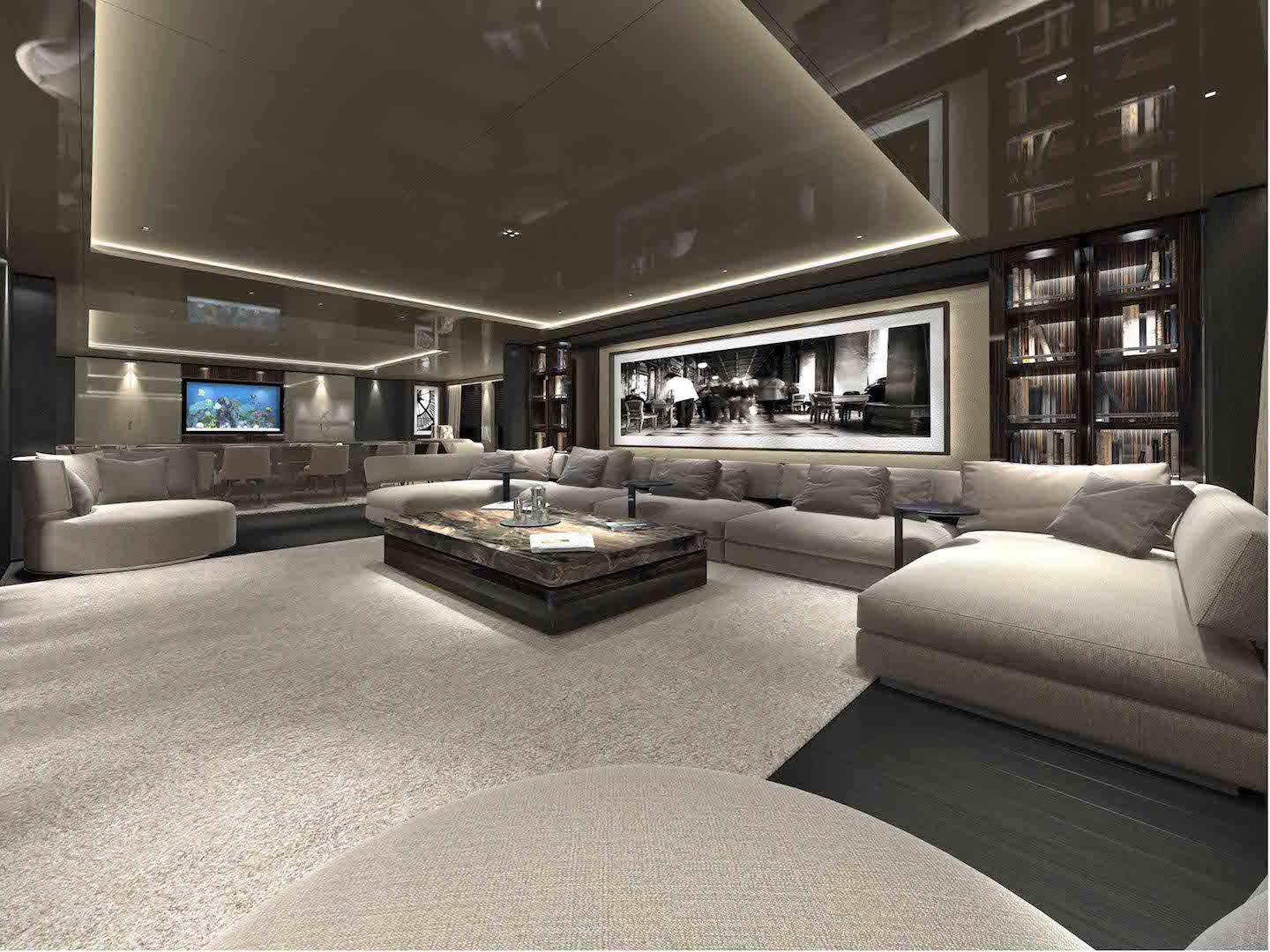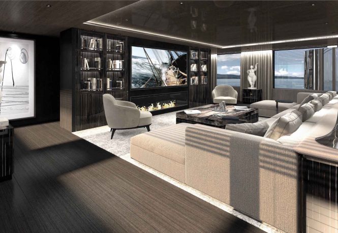 The aft of the Owner’s deck also has an observation lounge with floor-to-ceiling windows, a 90″ 4K QLED TV screen, baby grand piano, a bar and a fireplace, with direct access to the touch-and-go helipad deck that also provides a Jacuzzi, breakfast bar, alfresco lounge and a day head with shower.