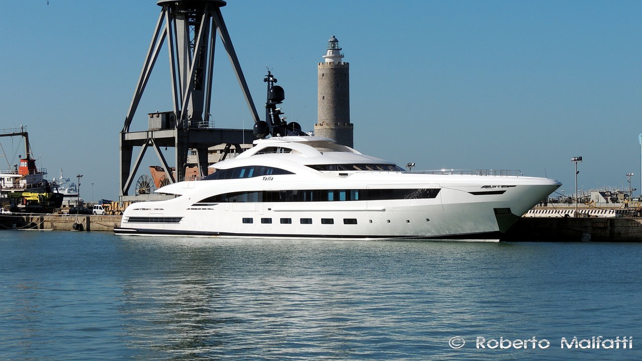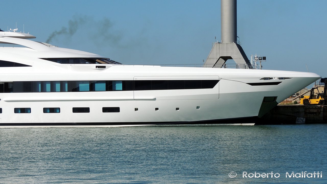 Below are a few images of the striking CRN mega yacht YALLA, spotted and photographed by Roberto Malfatti in Livorno, Italy a few days ago. At 73 metres YALLA features sleek and sporty lines with beautiful exterior design by Omega Architects. Interior of the vessel is by Droulers Architecture in close collaboration with the yard’s in-house design department.