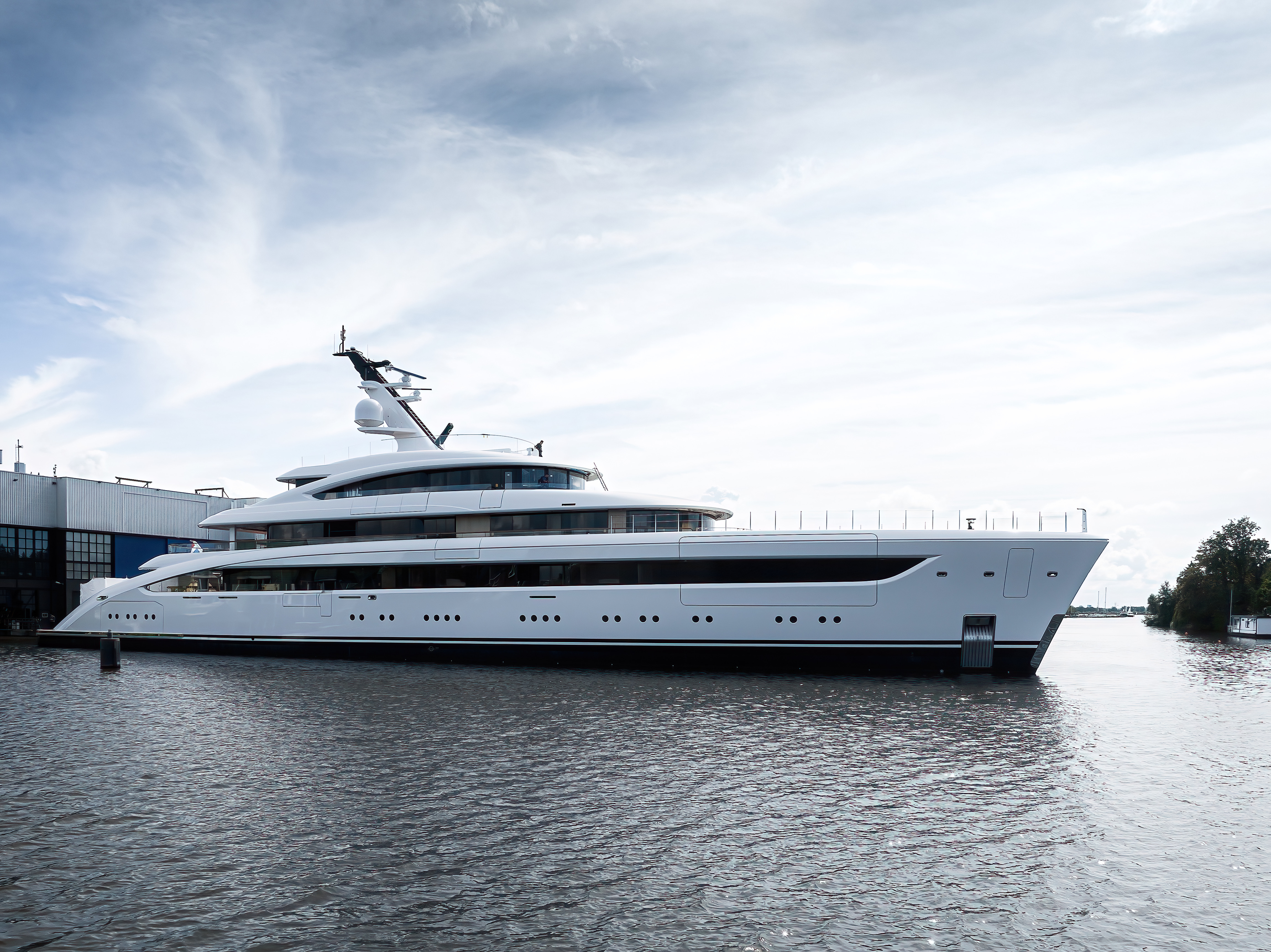 Feadship have shared images of 75.7m (248’4”) superyacht PROJECT 822, their latest project to enter its completion stage. She emerged from her drydock at Kaag Island in the Netherlands for the first time since she arrived there in 2021.