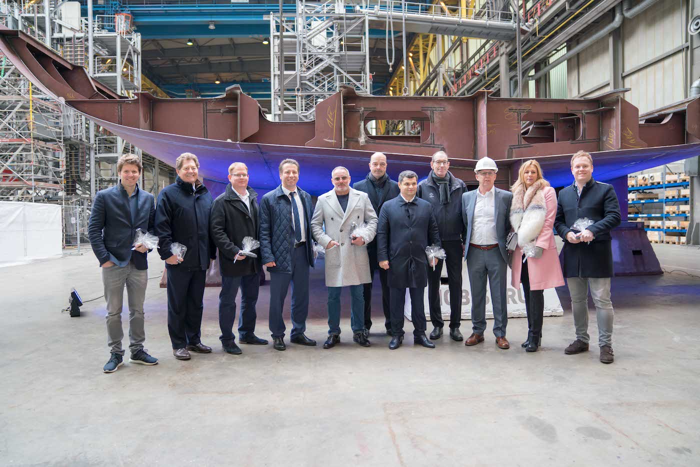 The keel laying ceremony placed the first section of the steel hull upon a special coin, which will remain in place until PROJECT BLACK SHARK is complete when the coin will then be removed and presented to the Owner for good luck.