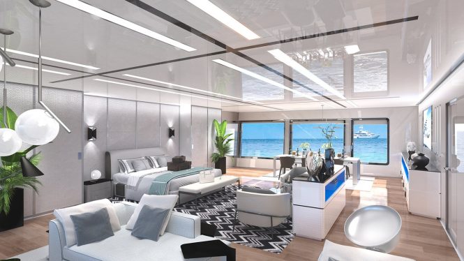 In addition to the full-height windows applied seamlessly across most of the decks, the futuristic exterior styling has mirror-like surfaces in the hull and superstructure so that the explorer yacht blends into the surroundings. There is a certified helideck installed on the bridge deck aft and from here guests can enter the interior to find a starboard gym and a port-side lounge. When not in use for transport, the helideck can be converted to a spacious outdoor lounge where guests can enjoy panoramic views. An alfresco Jacuzzi, plenty of storage for water toys, tenders and vehicles (including two Triton submarines), and an A-frame for their easy launch and retrieval are among the other features integrated into the design.