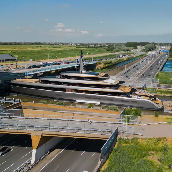 Superyacht OBSIDIAN (ex. Project 710) is on the move from the Koninklijke De Vries facility in Alsmeer to Rotterdam for her upcoming sea trials. The 84.2m (276’3”) Feadship yacht began construction in 2020 and is a collaboration between Casco & Sectiebouw Rotterdam (CSR), De Voogt Naval Architects and RWD with Monk Design.