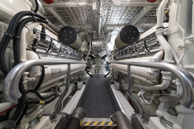 Owners have the choice of two engine configurations: A pair of 2,600 HP MTU 16Vs producing up to 45 knots and a cruising speed of 35-knots, or two 1,925 HP CAT C32s for a maximum speed of 38 knots and a cruising speed of 32 knots.