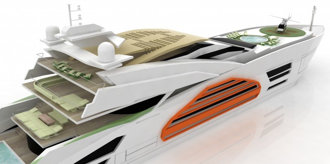 The luxury yacht design has an impressive length of 90 metres and the design is characterised by an aggressive and stretched exterior profile design with one “high prow” and wings made of coloured polycarbonate towards the stern.