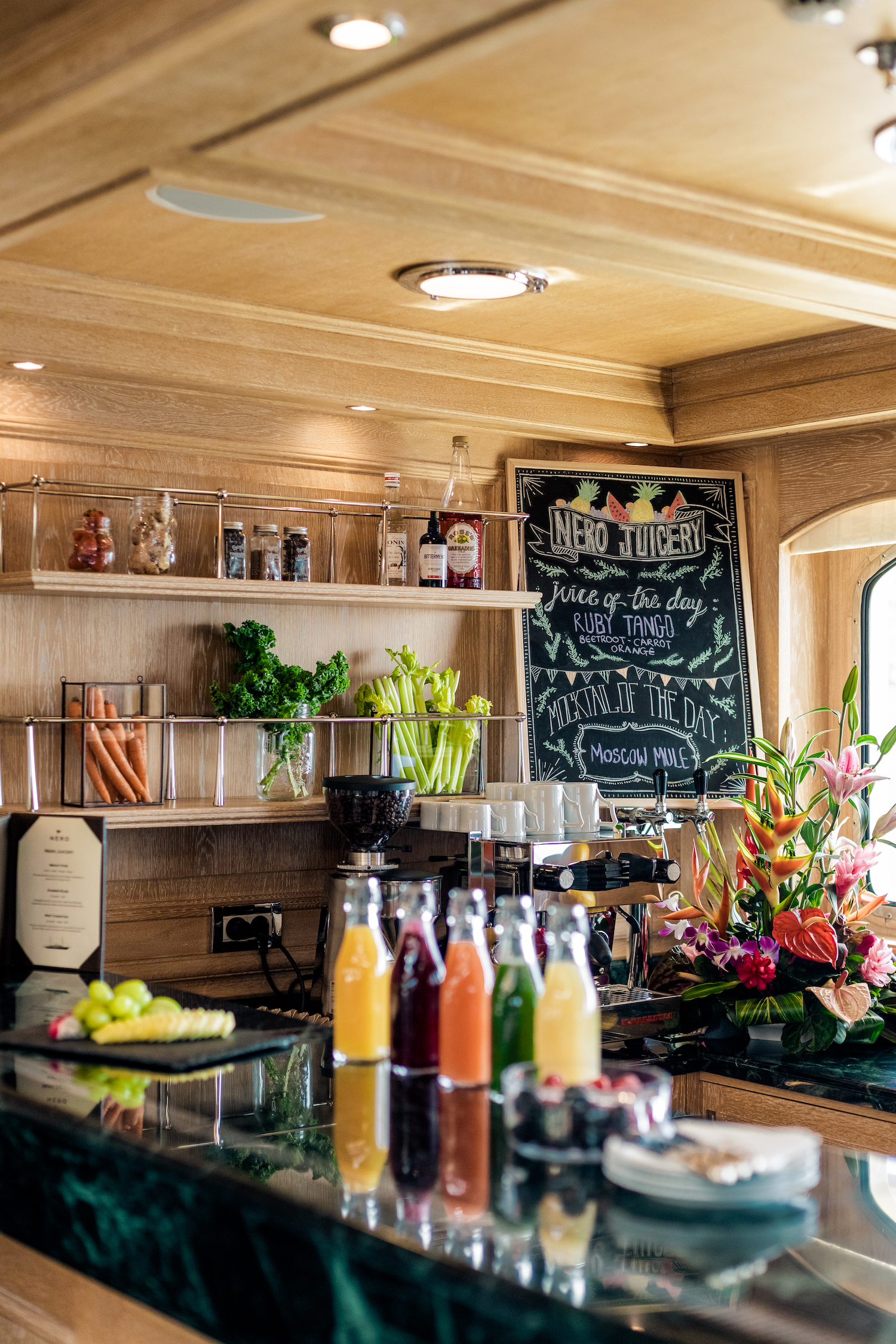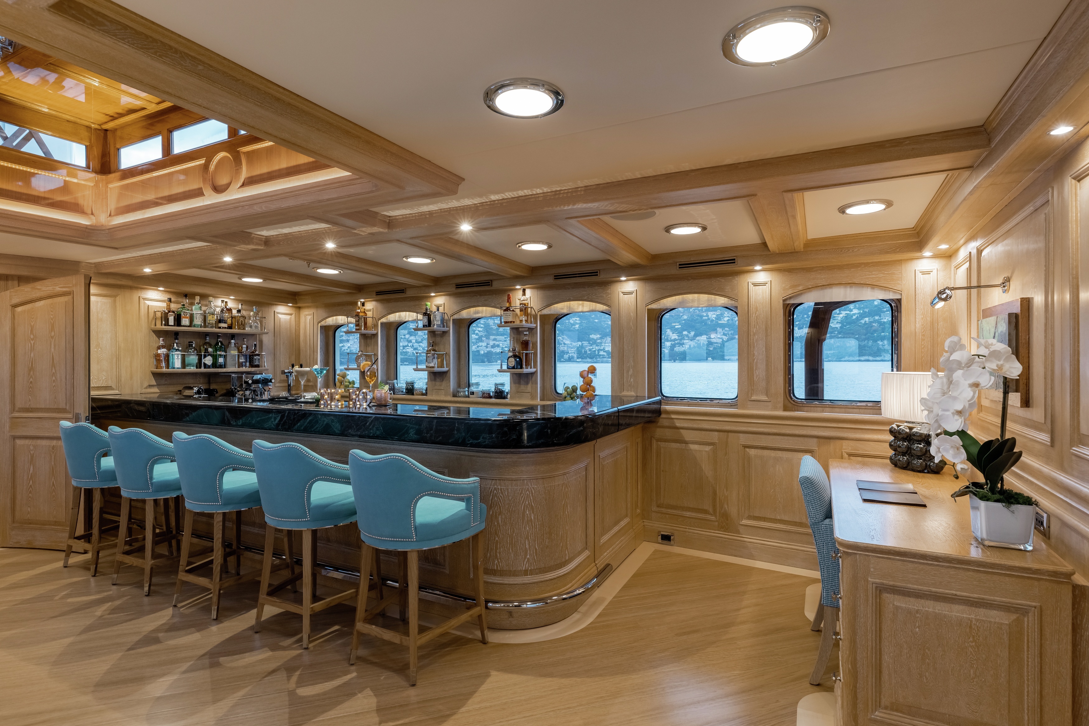 Interior designer, Laura Pomponi, joined me for dinner to share how she set about achieving this. “An important part of the refit brief was to provide the right dynamic for healthy living onboard,” explains Pomponi. “Being able to offer a full suite of spa treatments was an aspect we knew would further expand Nero’s charter success.” As onboard wellness becomes a more and more common request on the superyacht charter wish list, these modern amenities have been incorporated aboard Nero in a fashion that’s sympathetic to her classic aesthetic.