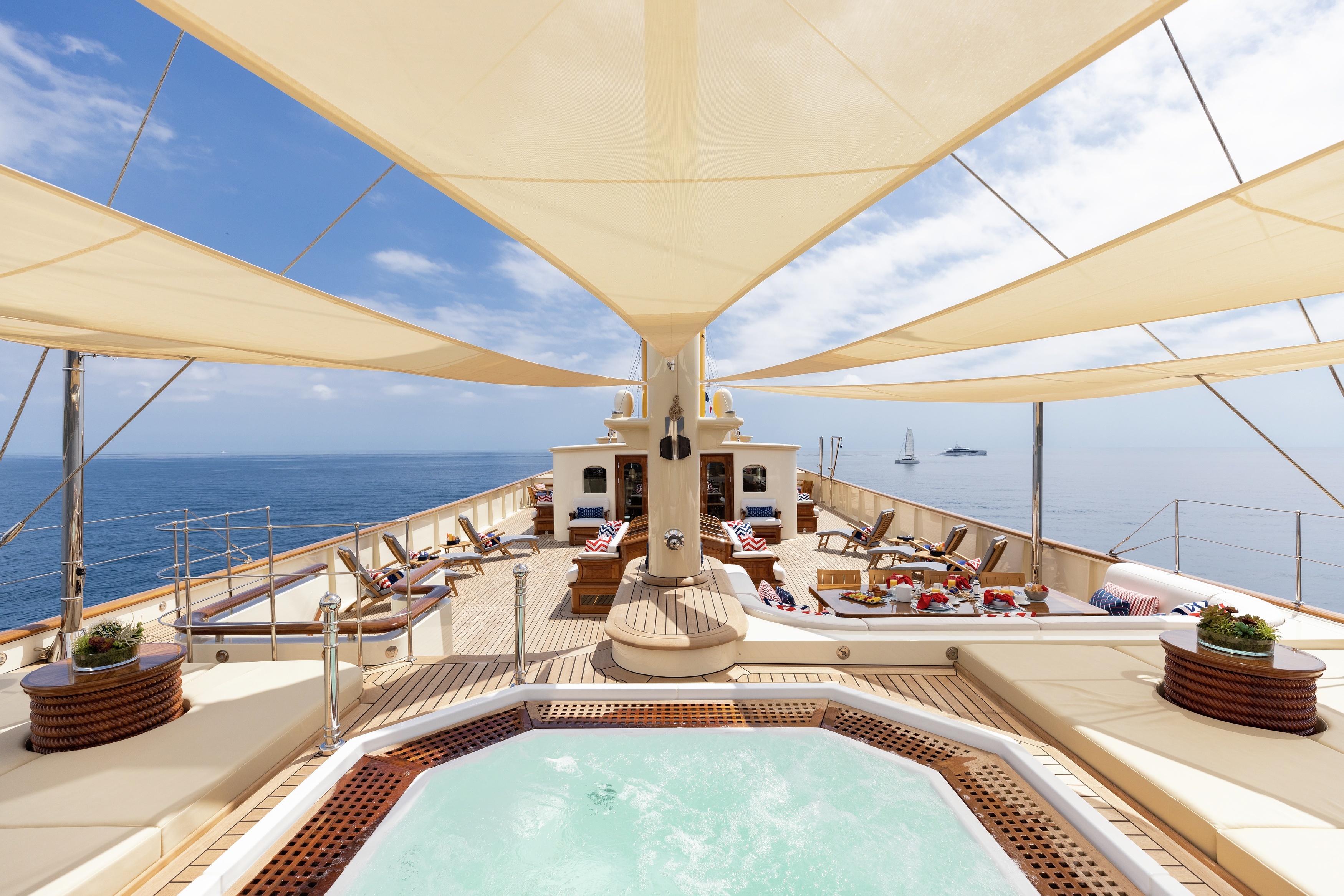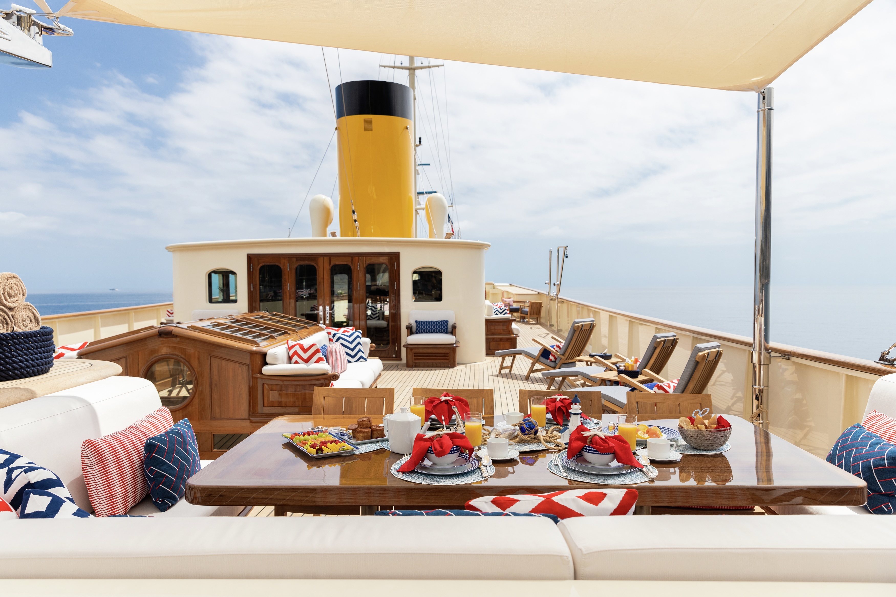 Nero has a stately formal dining room on the main deck, but the crew advise this is rarely used with guests favouring to dine al fresco at either of the aft deck tables. The sun deck offers a more intimate setting for meals, with a smaller table that’s cosy for couples.