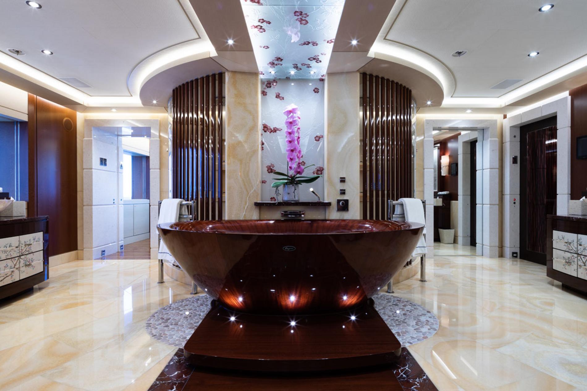 On board, guests have a wealth of entertainment options including live music in the piano lounge, a beach club and spa centre containing a sauna, hammam, experiential showers and plunge pool, a main deck aft swimming pool and two Jacuzzis, one of which is accessible from the Master suite.