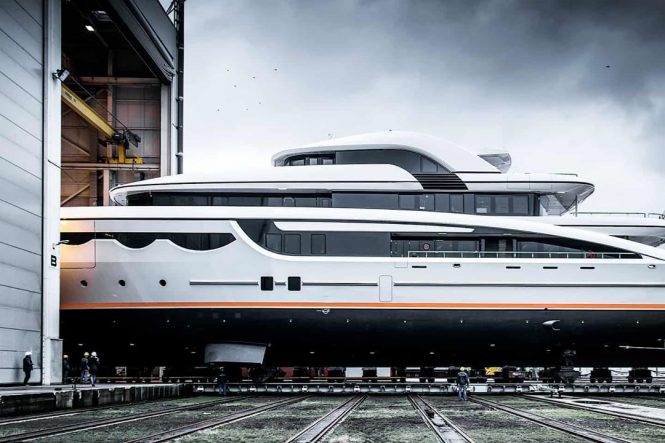 68m Superyacht SOARING emerges from the shed prior to her official launch. Photo credit Tom Van Oossanen for Abeking and Rasmussen