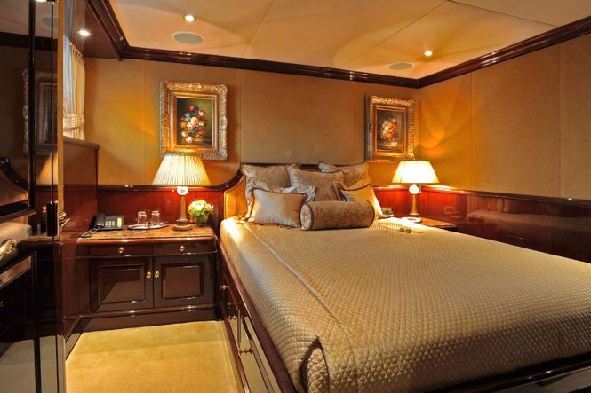 The onboard accommodation is designed to sleep up to 12 guests over 6 cabins: 2 Master suites, 1 VIP stateroom, 2 double cabins and 1 twin cabin.