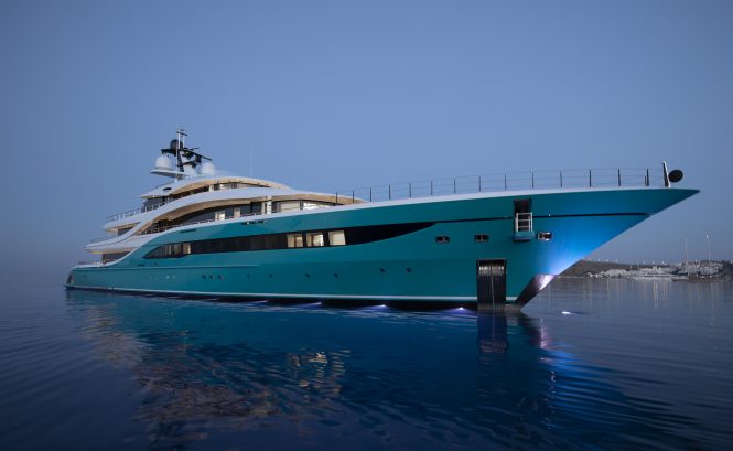 At 76.8m/251.8ft she is currently the shipyard’s largest project to date and draws the gaze of onlookers with her Turquoise-coloured hull that contrasts beautifully with her curving white superstructure. A sleek profile and raked bow add to her photogenic appearance and stature as a thoroughly modern motor yacht.