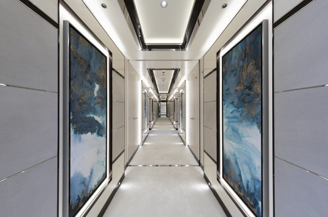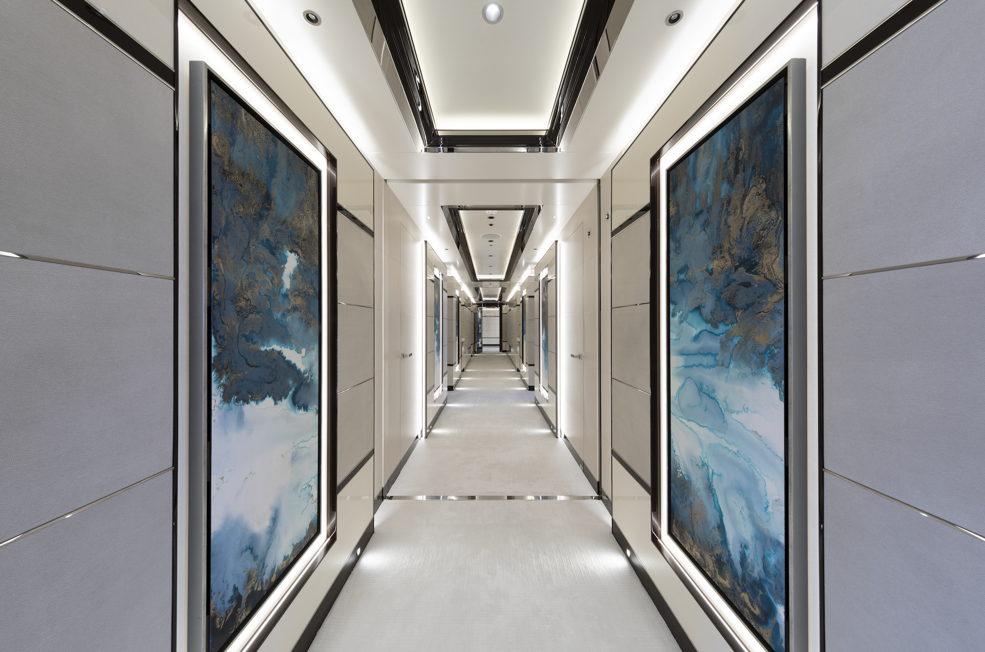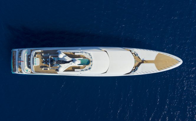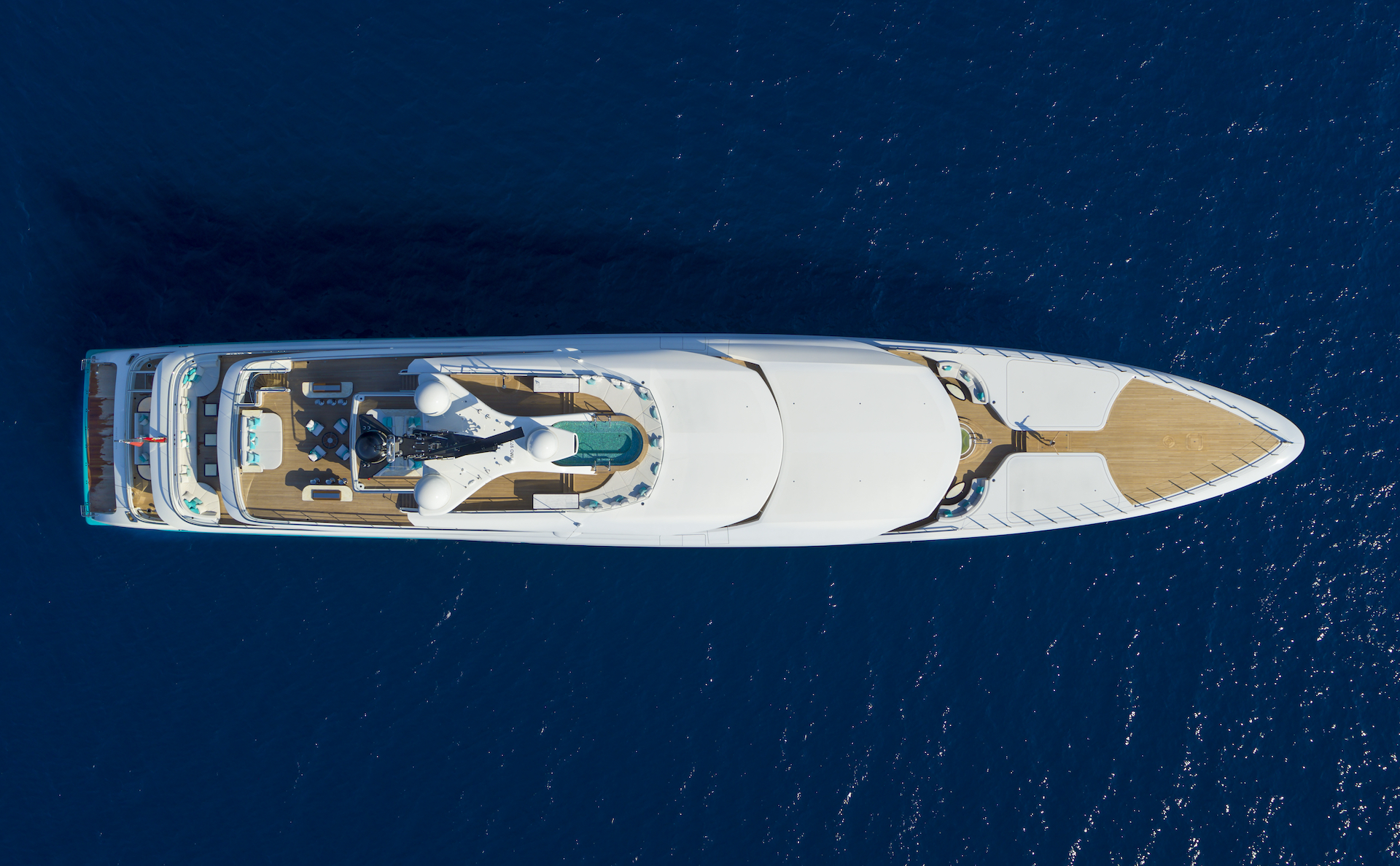 Alfresco lounges, dining areas and sunbathing spots span all five decks, and the Owner and guests have such indulgent amenities as a sundeck swimming pool and a whirlpool separated by a waterfall, a flush foredeck with a Jacuzzi, sofa/sunbeds, a helipad and an enticing lower deck beach club that has a light-up bar, widescreen TV and fold-down side-terrace.