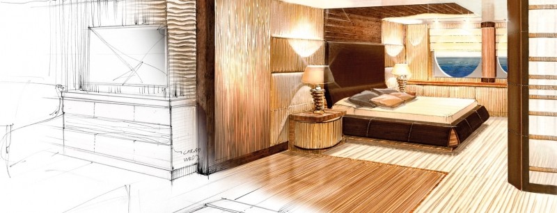 14 guests will be comfortably accommodated on board the luxury yacht Amels 199. Master and VIP suites can be set on the main deck, or on the bridge deck with doors to side decks and private beach. Three lower deck cabins will have direct access to the beach club. The Captain, Chief Engineer, and Chief Mate will have private cabins. Managed by a crew of 14 plus captain, the crew quarters will comply with ILO crew-welfare regulations.