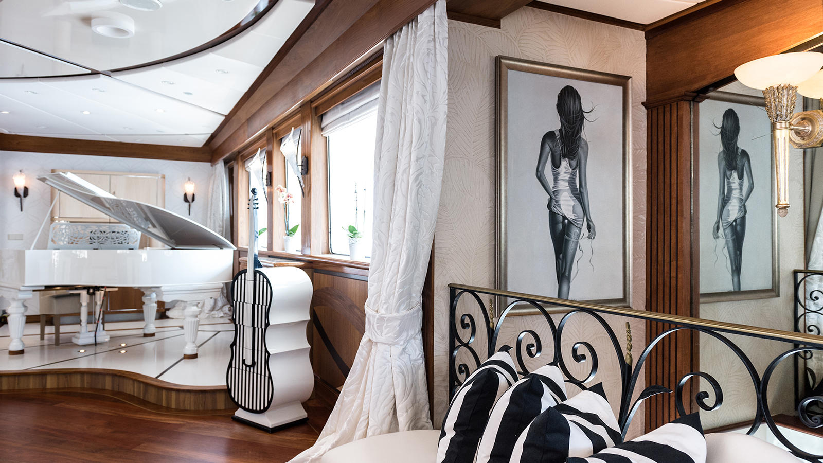 Her interior décor is elegantly appointed with a timeless finish and neutral furnishings throughout. The lavish finishes create a sophisticated and refined atmosphere and are exceptionally impressive. In the open plan main salon is a comfortable lounge, offers sumptuous seating and a coffee table situated in front of a relaxing fireplace. The formal dining table is aft, easily seating 20 guests. There is a full-service wet bar on the starboard side of the main salon, making the layout ideal for socializing. An upper sky-lounge features a lovely lounge area, wet bar and piano. Further to the gathering areas aboard, there is a gym, spa and cinema available.