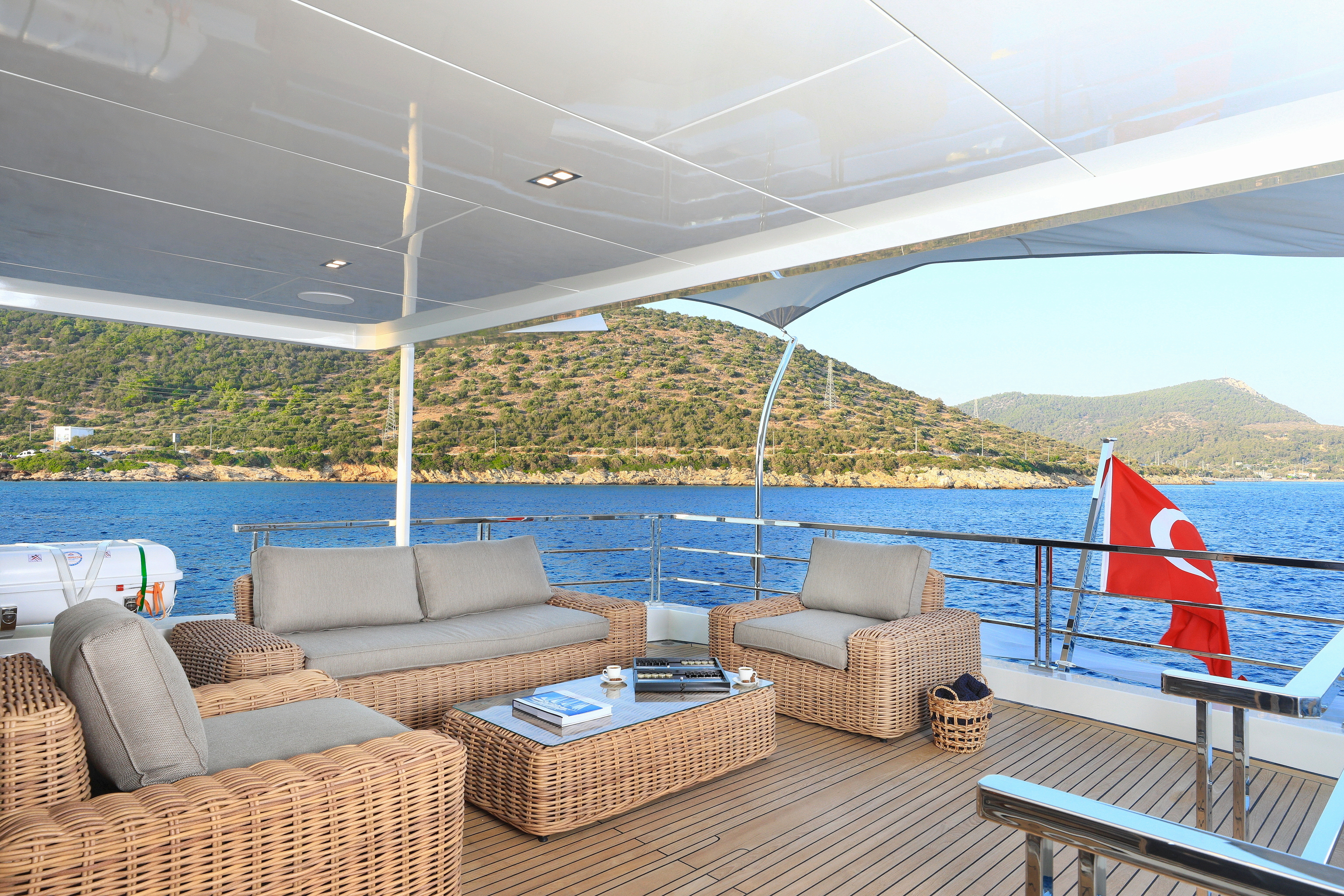 Performance comes from twin 650 HP MAN engines and two KOHLER 35kW generators, which deliver a top speed of 12.7 knots with a range of 3,500 nautical miles at a cruising speed of 9.5 knots.
