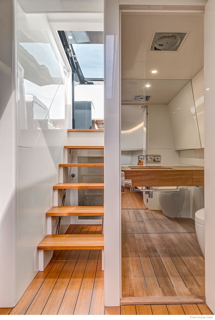 The interior boasts lovely teak flooring, leather wall panels and lacquered surfaces, resulting in a warm and inviting ambiance. the general arrangements and the furnishings are customisable to owner wishes, thanks to the boat’s large interior volume.