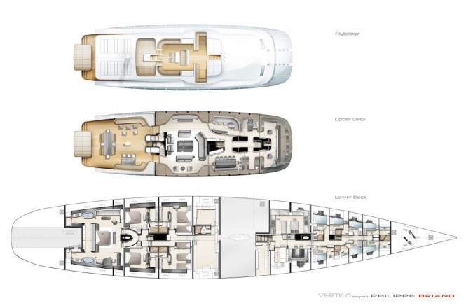 The lower deck layout shows 4 x guest rooms and huge owner’s state room aft.  The passage from this cabin leads directly to the lazarette and swim platform. Forward there is enough accommodation for 11 crew.
