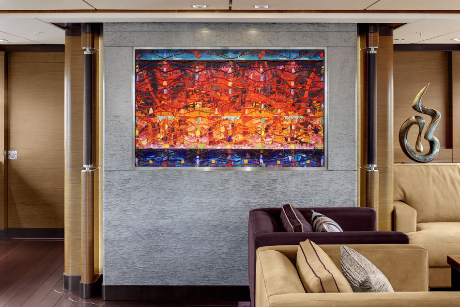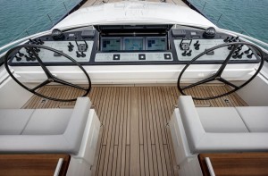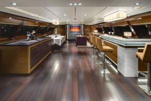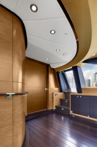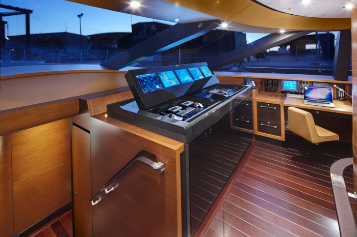 Kokomo’s owner had a clear idea about the look and operation of the SeaTouch monitoring system. While the technology inside is very similar to recent yachts, the aesthetics have evolved in a new direction. When the SeaTouch system is inactive, it is a flat sheet of tinted glass. Then, when activated, the forward glass panel slides back to reveal the control panel and the rear piece of glass lifts on an angle to become the monitor, or screen.