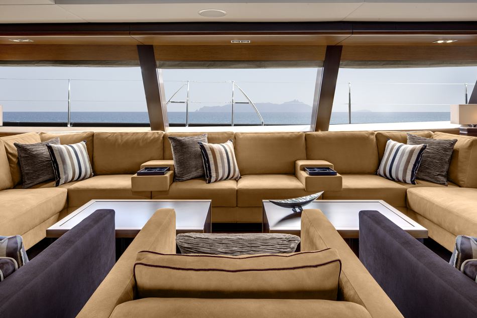 Another benefit of Kokomo’s large freeboard dimension is the ability to completely lower the custom-made glass screen that protects the aft cock-pit. The curved solid glass screen slides discretely into the back of the semi-circular seats, providing protection from the elements when needed.