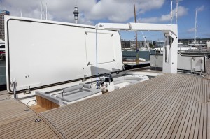 Another request from the owner was to ensure that the decks were as clear of equipment as possible. Alloy Yachts suggested that the bollards and fairleads are concealed inside the bulwarks. A sleek lid hinges open to access the bollards for mooring purposes, and when not in use, the continuous bulwark line and smooth teak deck is not interrupted visually or physically by these stainless steel necessities.