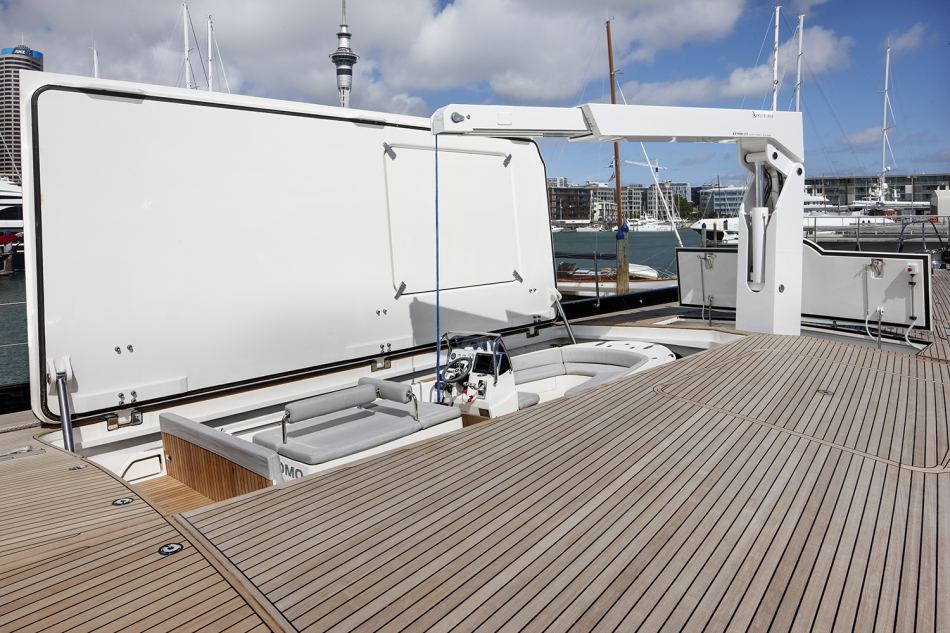 The increase in Kokomo’s freeboard enabled by the Dubois design has allowed Alloy Yachts to create a lot of under-deck storage capacity and negates the need for a pickle-fork structure. The ability to create much larger teak foredeck, going all the way back to the mast, is particularly sleek and aesthetically attractive. The custom-made spa-pool is inset into the deck under its own teak cover, leaving no unnecessary items remaining above deck to detract from the clean lines and sense of space.