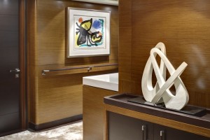 “Very dark, distinctive Wenge and light forest teak timbers accentuate chocolate-brown leather tops and chunky nickel hardware. Stronger features are created, with the help of the Alloy Yachts craftsmen, by wrap-round corner veneers on cabinets everywhere and the contrasting leather stitch-work.”