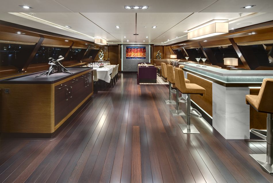 There is no doubt that Kokomo is a distinctively modern yacht with her stark white superstructure, glossy black hull and bright silver transom graphics. Trim is either teak or carbon fibre with all teak margins kept as small as possible to achieve the desired clean, contemporary look. Carbon fibre furniture and specific structural elements contrasts in a complementary manner with the teak.