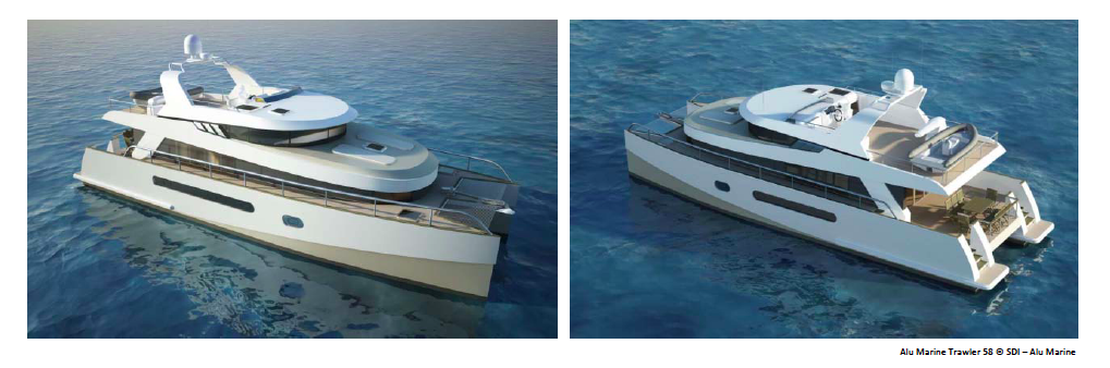 A new Alu Marine 65 Trawler yacht is due to be constructed by the well known Alu Marine shipyard in France. The 19,85m (65ft) catamaran’s construction has started in September and is scheduled for delivery at the end of 2012. The 58’ and 65’ trawlers have been created by ALU MARINE and the STIRLING DESIGN INTERNATIONAL (SDI) design office. ALU MARINE and SDI have incorporated vast living spaces, elegant hull lines, performances, comfort and excellent accessibility to berths.