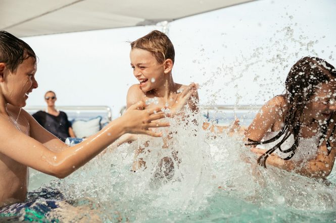 Inflatable toys are a hit with all ages and massive water slides attached to the upper deck or inflatable climbing walls will get young thrill-seekers jumping for joy. Inexperienced swimmers also benefit from an on board swimming pool to practise their skills and donuts and other assisting inflatables add to the fun while they gain in confidence.