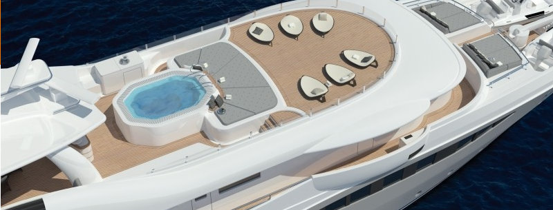 The main saloon fitted with an additional bar and seating area as well as two balconies, providing easy access to the open air is located on the main deck. There are also a full-beam skylounge and an extra large sundeck engineered for a touch & go helipad above the bridge.