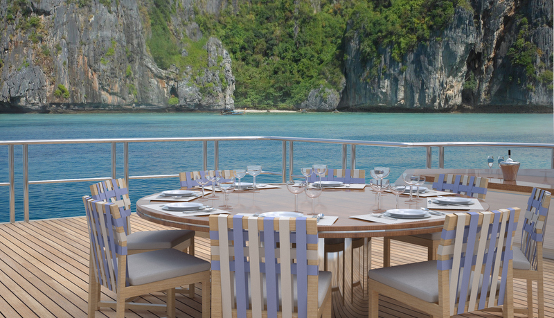 Moreover, the vessel features a highly innovative three-seat submarine custom-launch and recovery platform at the stern that provides the passengers with an easy access to the submarine. This mechanical system works by raising the sub, which is connected to the platform with arms that carry it up and over the stern bulwark with zero yacht heel, since the movement is forward aft and the pitch of the yacht compensates the weight of the sub. The platform arms stop when the sub is at a safe distance from the water, and it is then lowered using a winch fitted within the platform. To raise the level of safety, guests board the sub when on deck before it is launched.