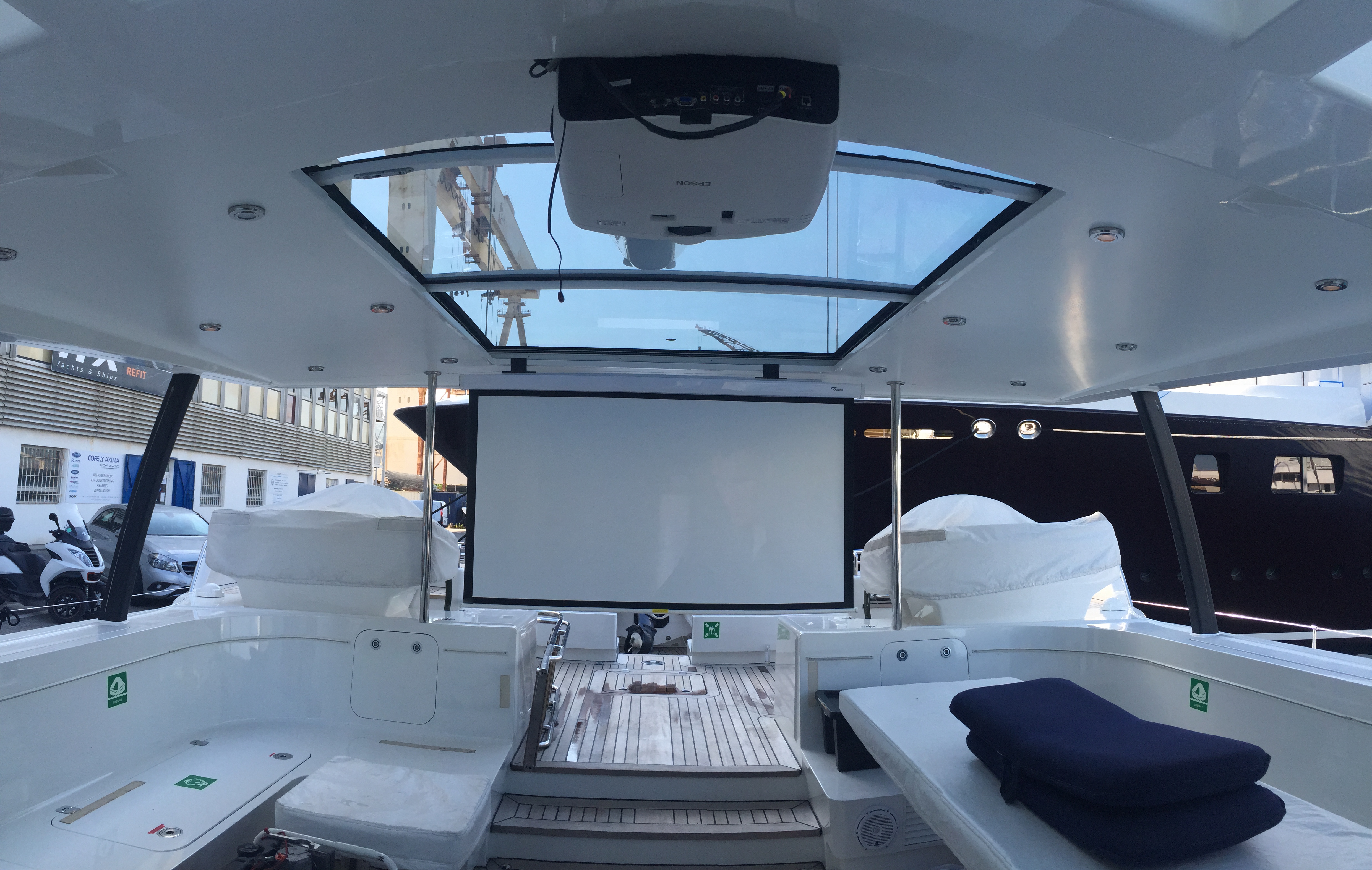 The original Veritais installation included the yacht’s Epson full 3D projector outdoor cinema, which gets a lot of use as the central entertainment area, as well as on-board Wi-Fi and lighting control. The onboard system comprises eight independent zones, including the four guest staterooms, each controlled using a Control4 seven-inch tablet, not dissimilar to an iPad, plus an alternative ‘hard-button’ remote and the outdoor projector system.