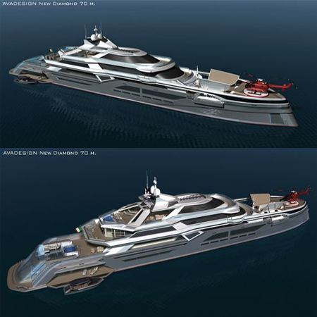 Avadesign has revealed their latest 70-metre motor yacht concept NEW DIAMOND by Andrea Vastano. The 70-metre motor yacht concept began when a Russian ship owner requested a concept that should have strong and clean-cut exterior lines. With the collaboration of James Van Der Marwe and Fabio Cardinale, the New Diamond superstructure will span four decks, be would be built of aluminium and would utilise eco-sustainable technology. One of the main aspects of the design was to create a yacht that would be as “green” as possible, an increasing trend in the Superyacht industry.