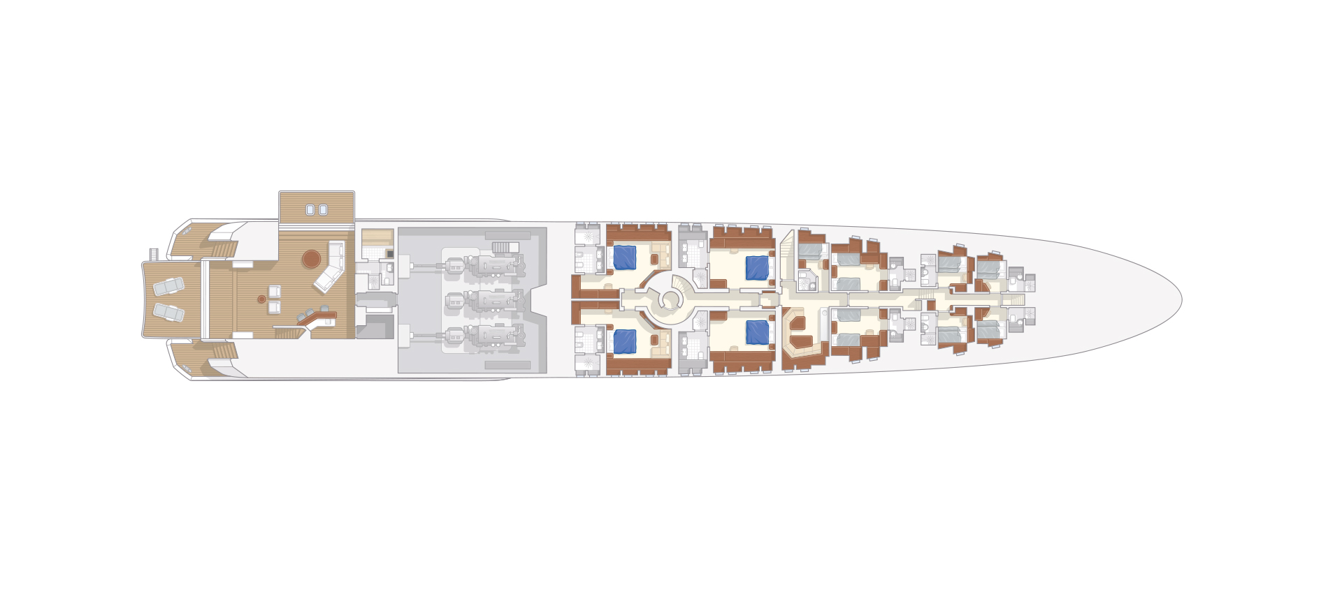 So much space, so many options. Galactica Super Nova has an incredible 357 square metres of deck space. From its luxurious sundeck to the beach club, there are twelve alternatives for guests to choose from, including sunbathing, dining, spa, Jacuzzis, jet-pool or just lounging around in the sun or shade.