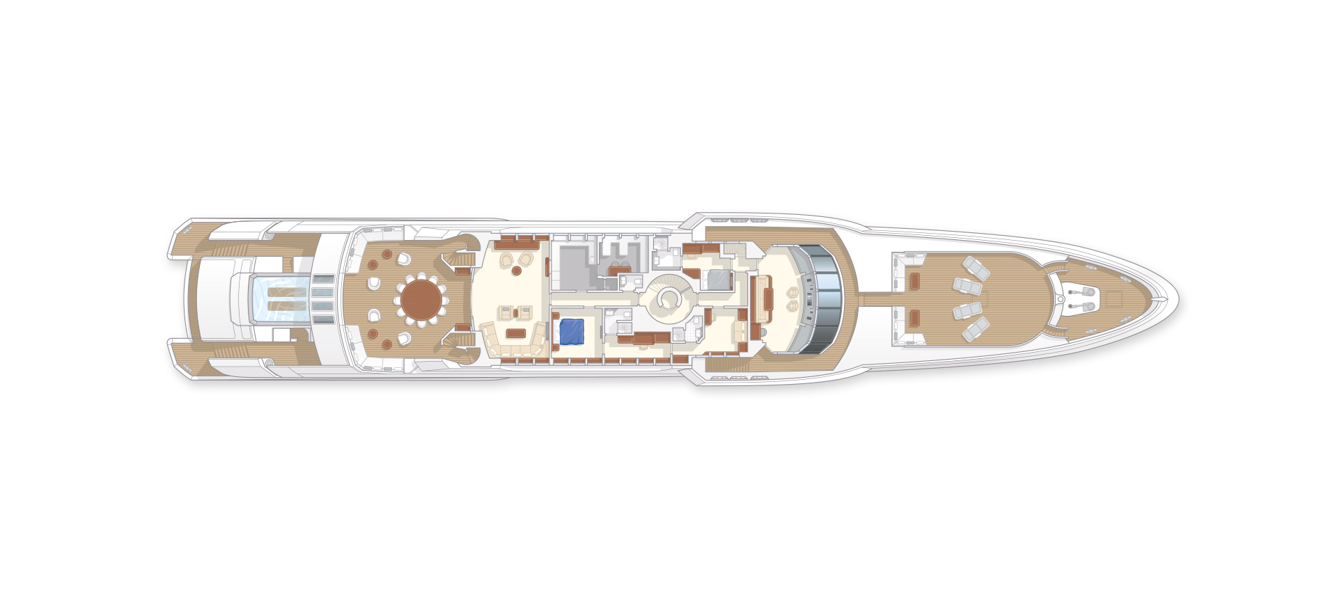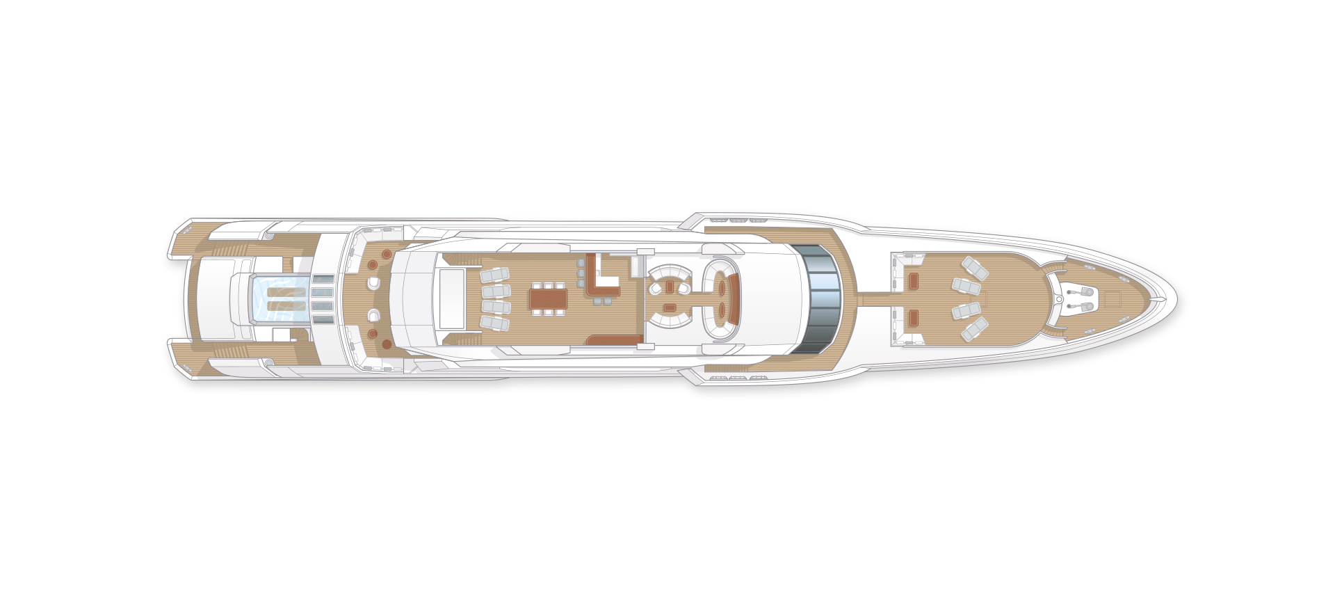 Advanced technology includes the revolutionary Fast Displacement Hull, plus fixed-pitch propellers combined with a Rolls Royce central booster jet Foredeck can be used as touch-and-go helipad, sunbathing, informal dining or transformed into an outdoor cinema 6m swim-jet infinity pool with waterfall, glass-panelled bottom and spa jets for hydro massage 44 square metres space of folding platforms from the 146 square metres beach club Shaded sundeck that includes sunpads, barbeque, bar, dining area and lounge.