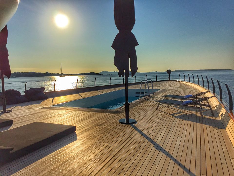 The generous interiors of AIR yacht can comfortably sleep up to 14 guests across 7 lavishly appointed cabins, including a gorgeous master suite, a VIP stateroom, 4 double cabins and 1 twin cabin. The vessel is taken care of by a numerous crew of 21. Moreover, there are similarly generous outdoor entertainment areas on aft and sundeck.