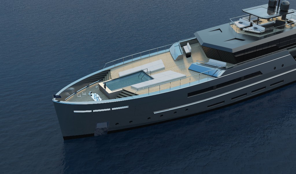 In the current design, the lower deck there is a gym and spa with direct access to the sea via a swim platform. A tender garage towards the aft stores a 7.5m tender while a second garage in the bow stores jet skis and the water toys.
