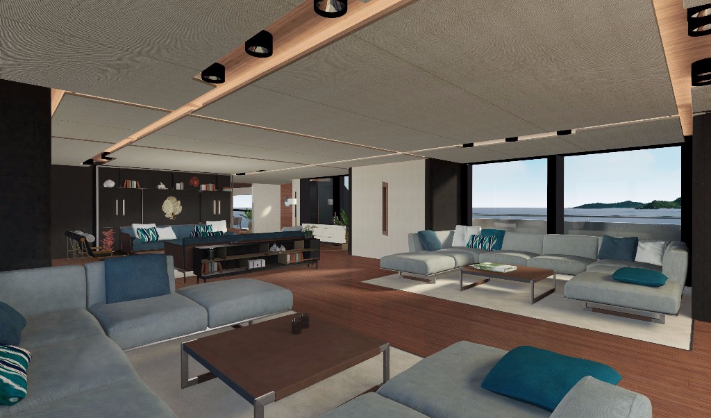 Balance between internal and external deck space is a key feature of the design, while a top speed of 16 knots and a cruising speed of 12 knots is achieved by 2 x Caterpillar 3512B HD DITA-SCAC engines. A hybrid version will also be available to offer owners customisation.