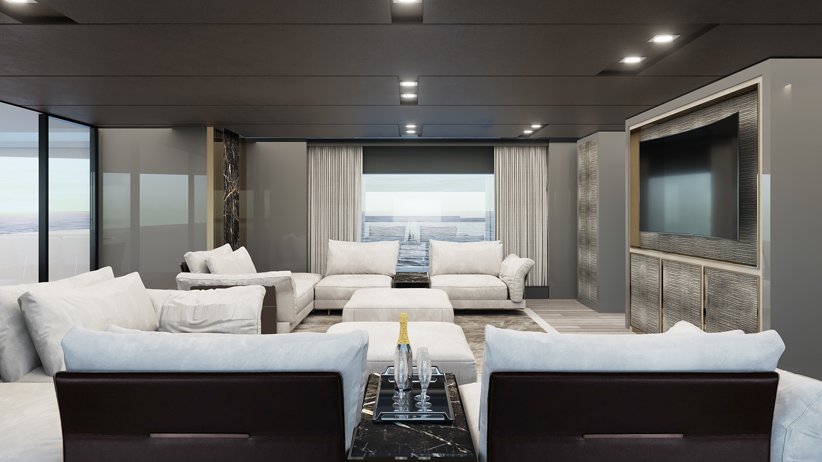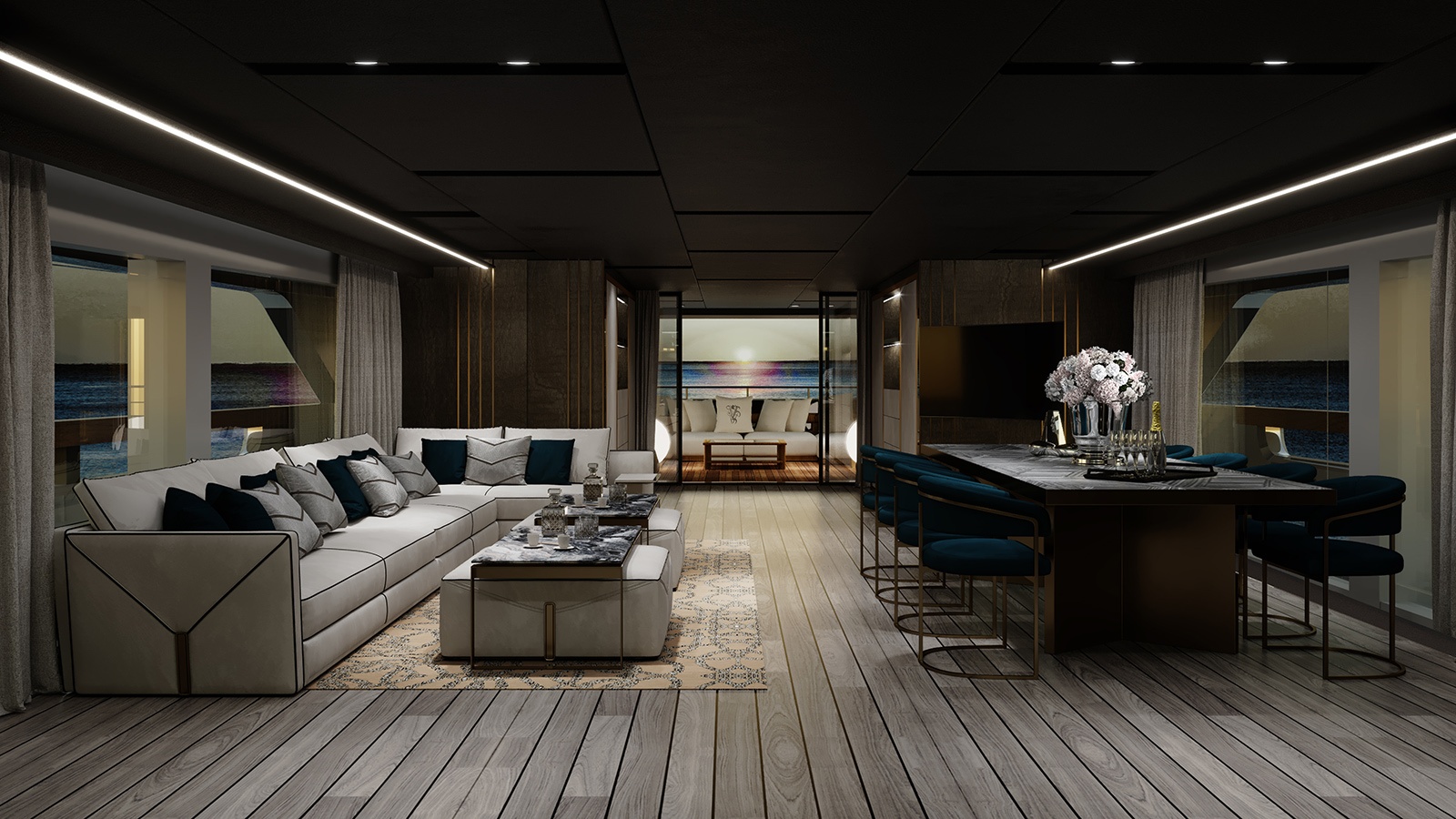 Soft and natural shades are present in the decor of the living and dining areas, while the owner’s cabin has a more vibrant design with the Vissionaire’s latest collection’s furniture and fabric wallpapers. Located on the lower deck, guest cabins benefit from wood and marble panels and various fabric wallpapers.