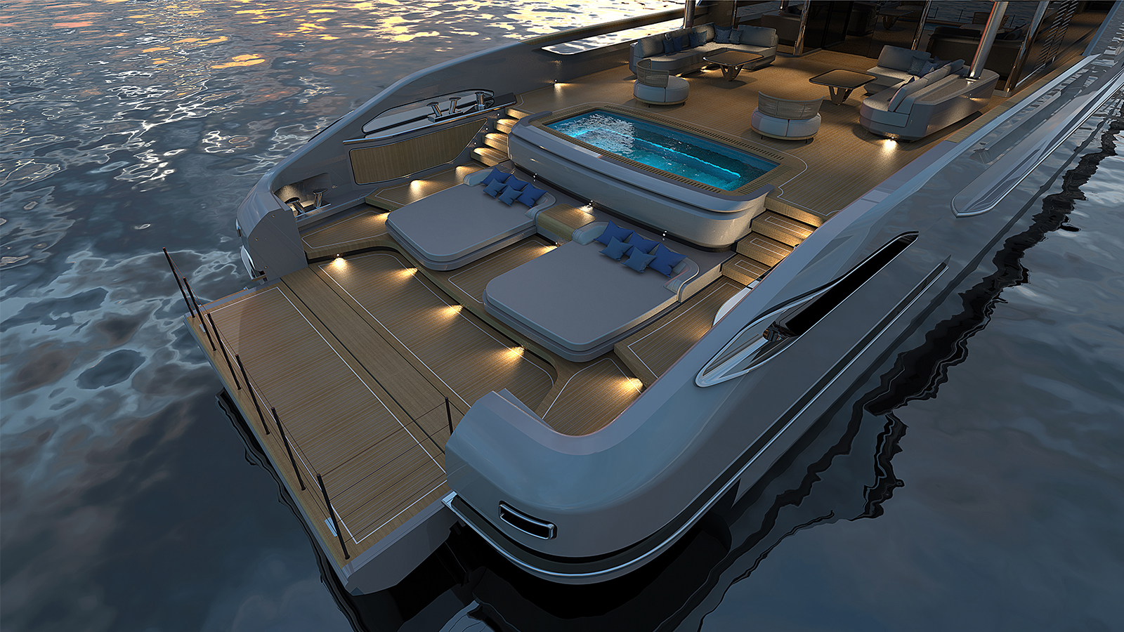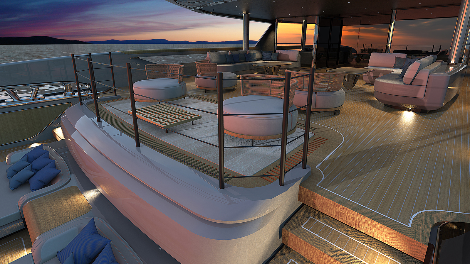 Away from her sustainable credentials HULL 10238 has a split level beach club and aft deck with a pool which can be covered with a moveable floor, a 24m sun deck and beautiful interiors. She can accommodate up to 12 guests in five ensuite staterooms including a full beam main deck master, two doubles and two twins with additional pullman bunks.
