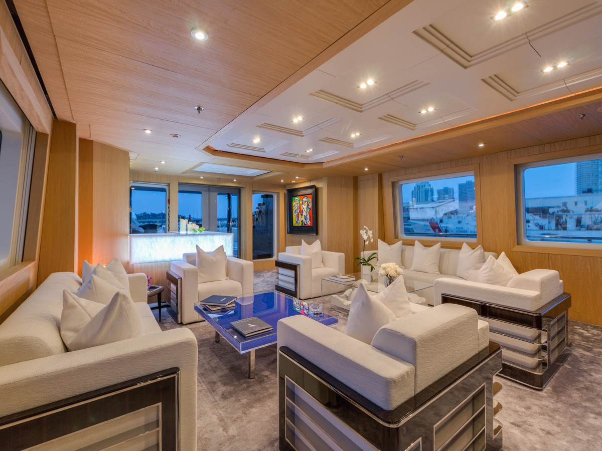 Her interior décor is elegant and minimal, yet with all the creature comforts, one would come to expect of a yacht of this calibre. The ambiance is welcoming with soft neutral tones throughout, creating a relaxed but still exceptionally elegant feel, the perfect combination. The main salon offers generous seating, coffee tables and a unique ice effect, backlit wet bar. Forward is the formal dining area. An upper skylounge features more lounge seating which can be set as day beds, perfect to sit back and enjoy the TV entertainment.