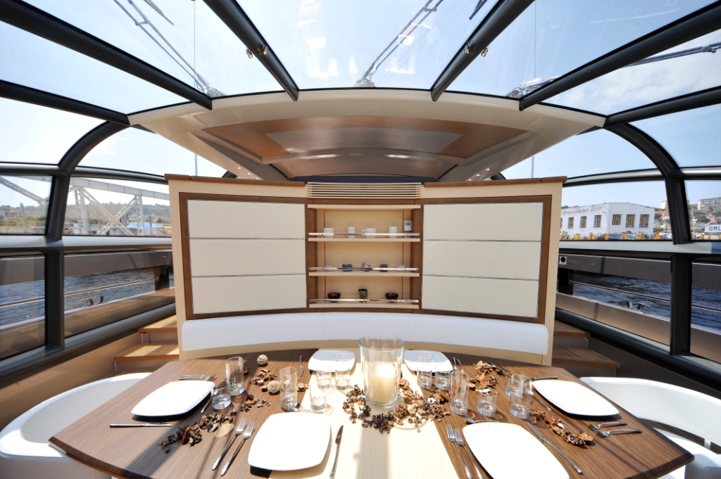From stern to bow the Baia 100 yacht offers one large “open air” living space. A large glass covered enclosure over the bridge flows onto the open deck space. Her superstructure offers uninterrupted view with no visible divisions between exterior and interior living spaces while still allowing for protection from the elements via her glass folding aft doors. The accommodations below deck are also light and spacious. There is comfortable accommodation for up to 10 guests in 2 twin and 2 double cabins.