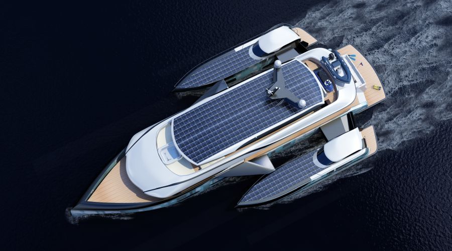To provide comfortable leisure for divers on the boat all technical support amenities and compressors are located in auxiliary hulls that allow to take compressors’ noise away from cabins and avoid air pollution. At anchor, the trimaran uses only electric motors, which reduces noise and do not generate exhaust gases. A battery bank charges from solar collecting panels and ensures an operation of electric motors and all systems. They are located on a roof of the flybridge of main vessel and hull surface of auxiliary vessels. The main advantage of such systems is a possibility to save diesel oil and protect the environment.