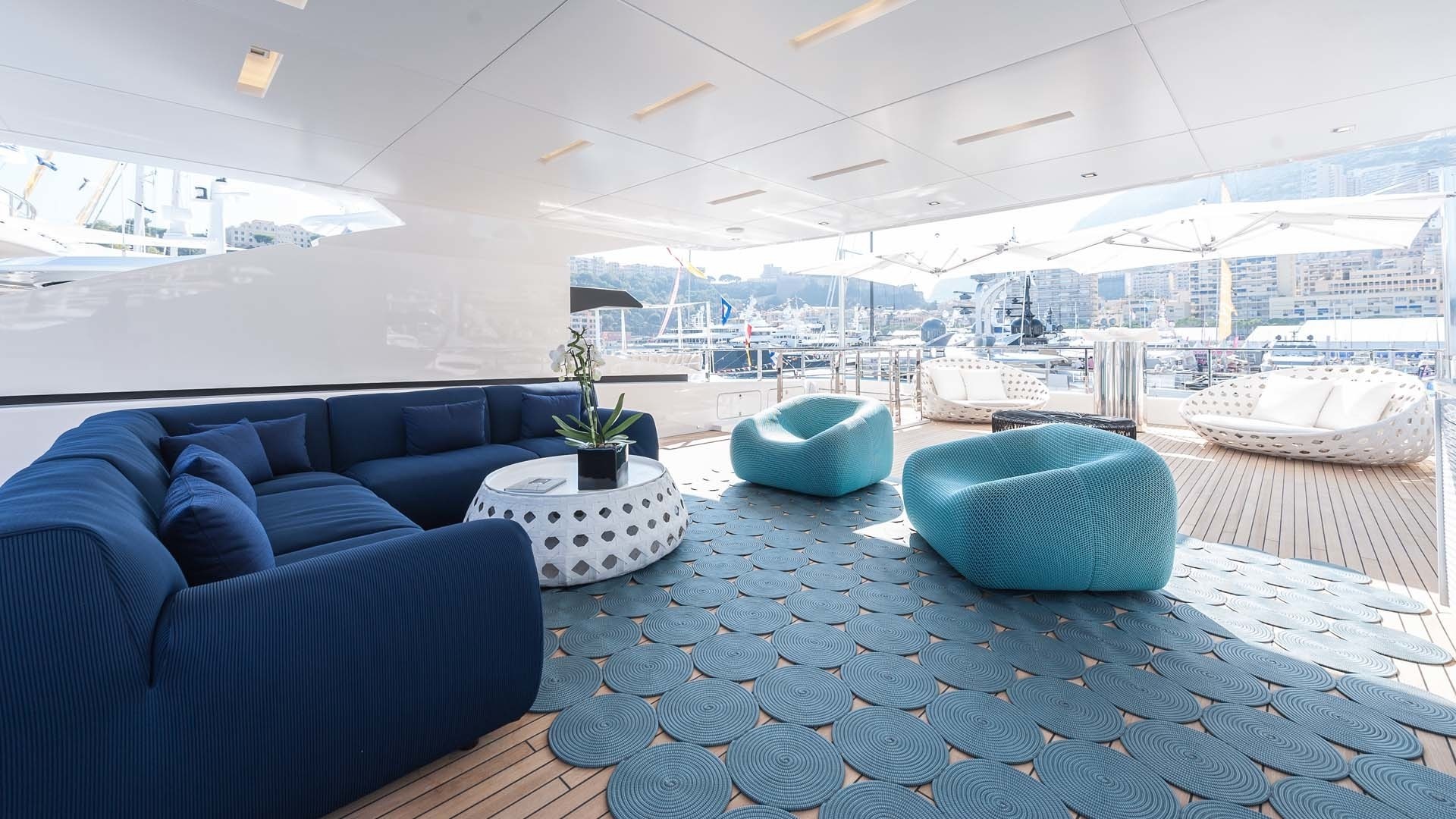 ~ On deck master suite ~ Two excellent interior living areas ~ Private gym ~ Ample on deck living ~ RYA approved water sports ~ Jacuzzi ~ Alfresco dining ~ Zero speed stabilizers ~ Wifi