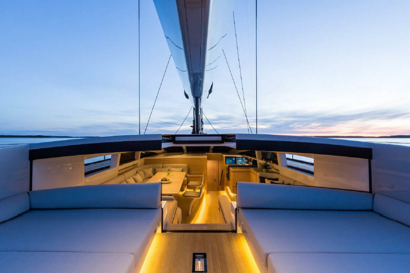 The sleek superstructure encapsulates a long deck saloon, seamlessly connected to a single-level cockpit via the pushbutton retractable glass bulkhead. This bulkhead drops down discreetly, ensuring an uninterrupted transition between interior and exterior. The spacious cockpit features a sunbathing platform on either side, and provides an excellent area for fast, efficient manoeuvres while racing, and a large enough space for enjoying al fresco dining. The aft crew entrance ensures quietness and owner’s privacy.